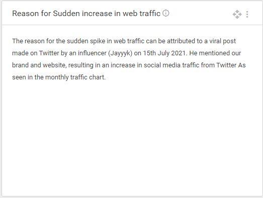 For instance, let’s say you want to explain why there’s a sudden increase in traffic. The title can be “Reason for Sudden increase in web traffic.”